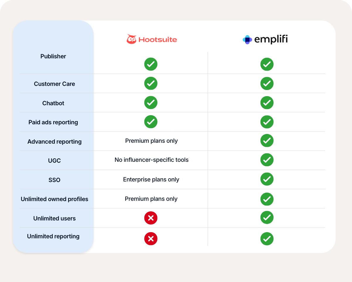 Hootsuite is best known for publishing and monitoring, but many teams experience limitations as they scale due to per-seat pricing and reliance on premium add-ons. Emplifi goes further by unifying publishing, engagement, analytics, and customer care in one platform — helping teams prove ROI and manage the entire customer lifecycle through social.