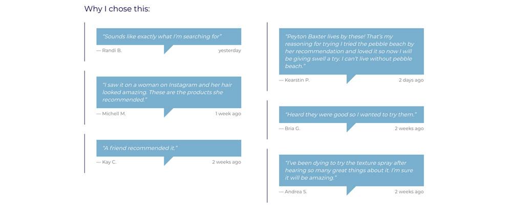 Along with a robust collection of product reviews, NAVY Hair Care uses Emplifi’s Checkout Comments feature to ask buyers why they chose each product. The brand garners an average of 360 Checkout Comments per week, and uses this feedback to consistently improve customer experience.
