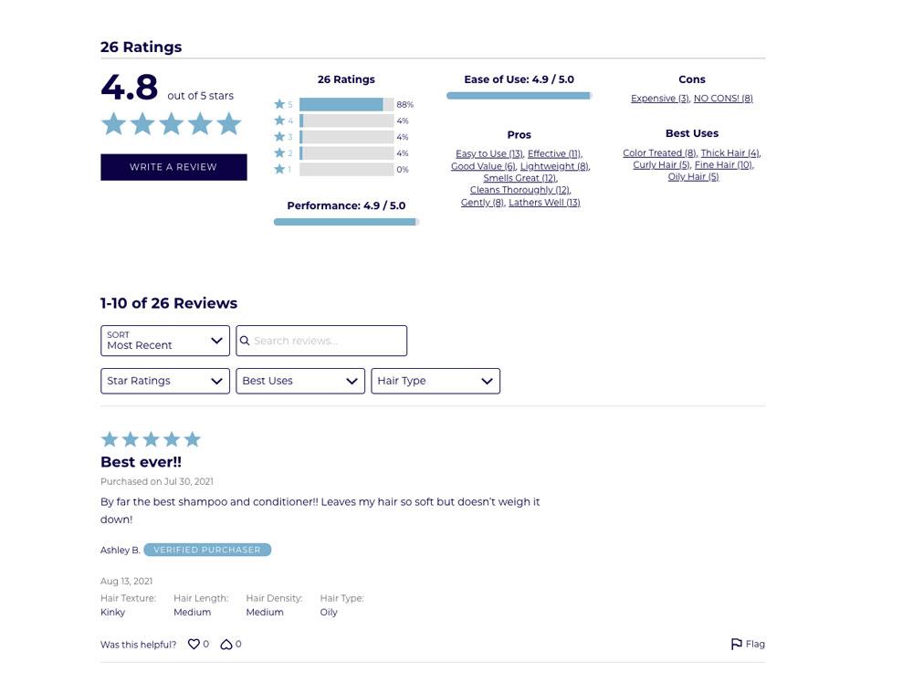 With Emplifi’s custom review subdimensions, the NAVY Hair Care team is able to provide the most valuable product information on each PDP. With this feature, the brand can solicit specific and relevant feedback on each product from engaged customers. By asking standardized questions such as “hair type” and “best uses,” the NAVY Hair Care team can glean valuable product insight for future innovations, all while adding value to the customer experience on-site.
